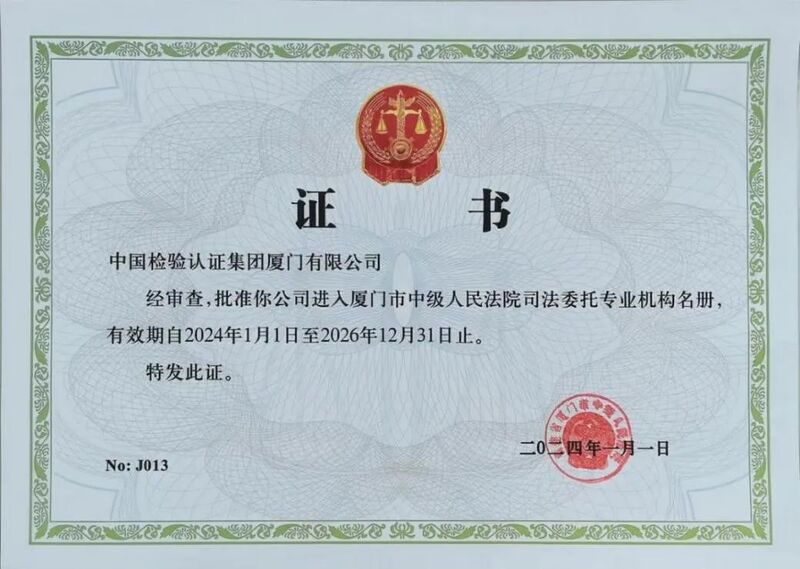1月2日,中国中检厦门公司顺利通过厦门市中级人民法院司法鉴定资质审核,成功进入厦门市中级人民法院司法鉴定机构名册,入册信息同步到人民法院委托鉴定系统,这标志着厦门公司可以正式接受法院摇号和产品质量鉴定类司法委托。